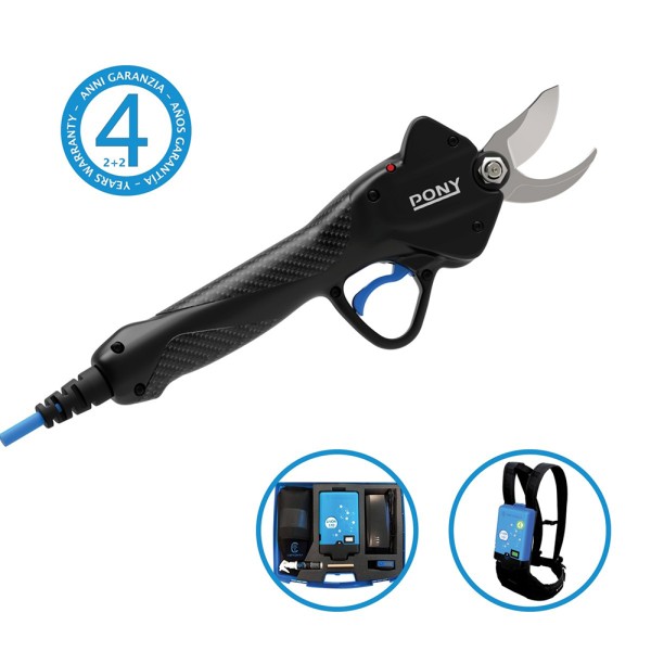 - Μπορεί να λειτουργήσει με την μπαταρία πλάτης Li-Ion 700 της Campagnola που χρησιμοποιείται στα ελαιοραβδιστικά μπαταρίας (Παρέχει αυτονομία 30ωρών). Σε αυτή την περίπτωση μπορείτε να αποκτήσετε το ψαλίδι Pony Pro χωρίς μπαταρία (κατόπιν παραγγελίας).